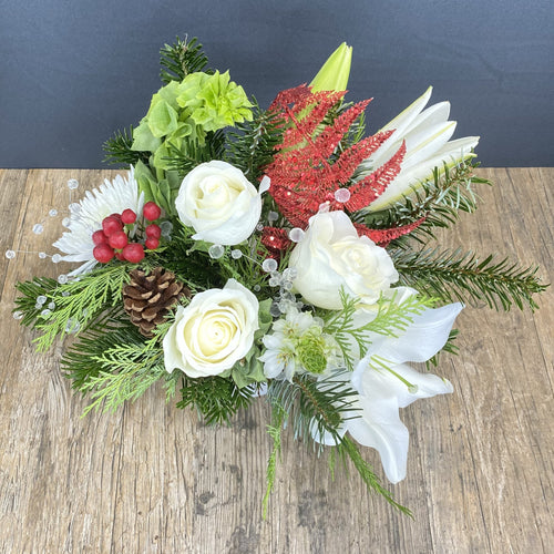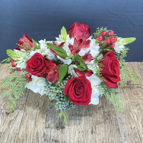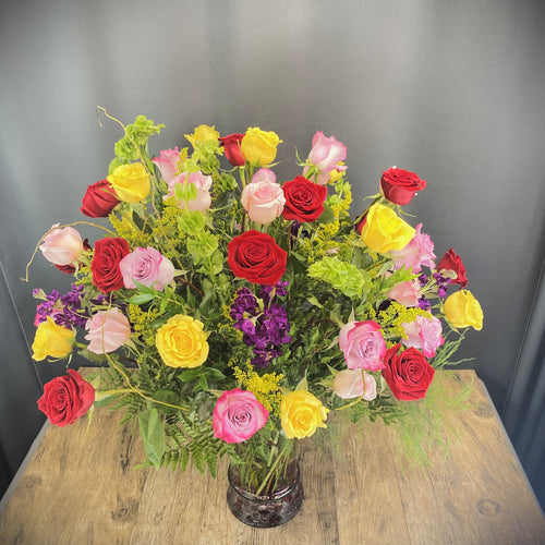 Our certified designers will select currently-available, seasonal flowers and accents from our coolers to match the colors and design style of your choice.