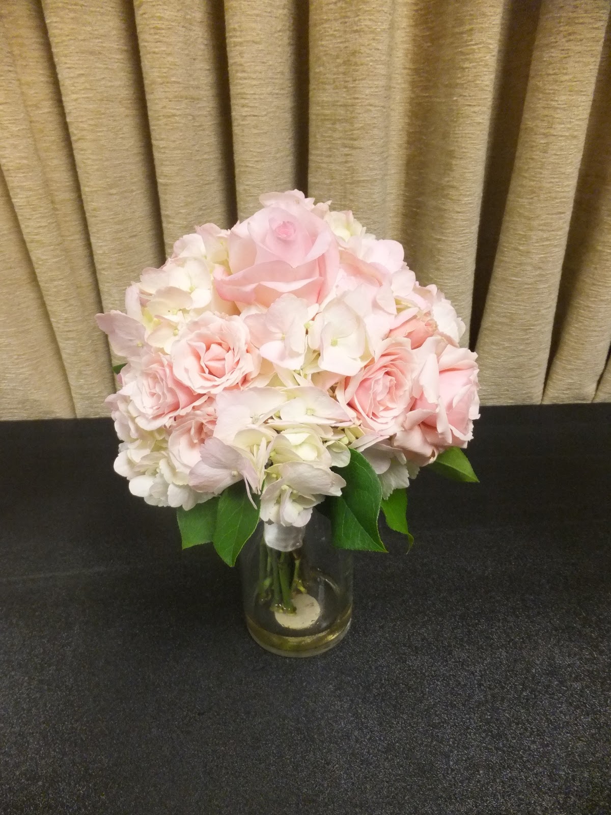 This soft and romantic bridal bouquet of white hydrangea and various sizes of pink roses smelled heavenly.