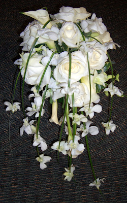 I love the timelessness of a fabulous cascade bouquet and this one stole the show with white dendrobium orchid blooms strung along bear grass mixed with white roses, calla lilies and touches of greenery.This mix of miniature calla lilies is a striking design of beautiful line, simplistic texture and contrasting color. We love weddings!!!
