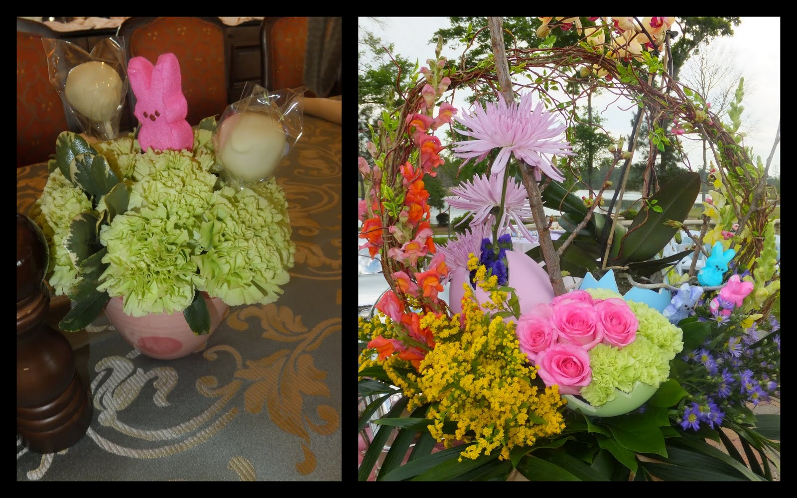 The centerpieces for the children's tables were bright and colorful with paved carnations and peep bunnies!