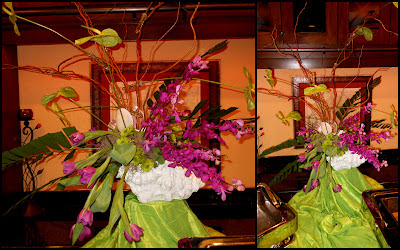 Each year we have a wonderfully busy Easter weekend with lots of events and fun parties. But we always like to showcase our annual events at The Club at Carlton Woods starting with Friday nights seafood buffet. Above is a fabulous piece with purple mocara orchids, green anthirium, purple tulips, curly willow, and green spider buttons in a giant sea shell.