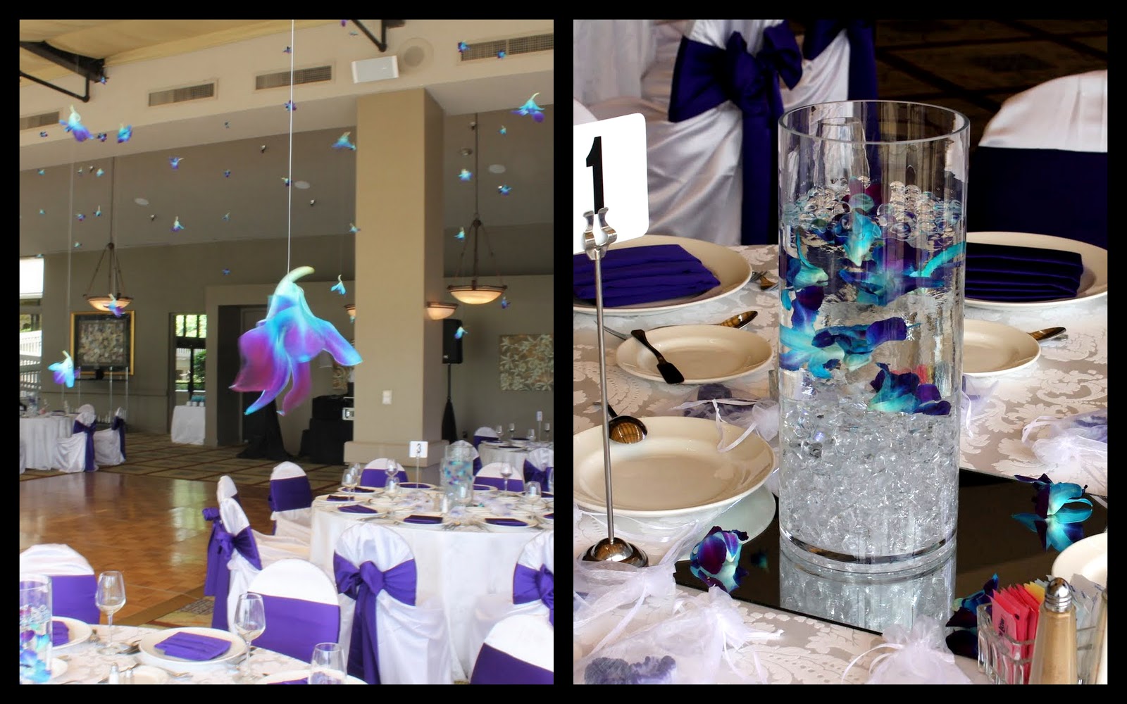 The reception was held in The Glass Ballroom at The Woodlands Resort and Conference Center. With blue dendrobium orchids hanging from the ceiling and contemporary centerpieces with floating orchid blooms submerged in cylinders the room was amazing.