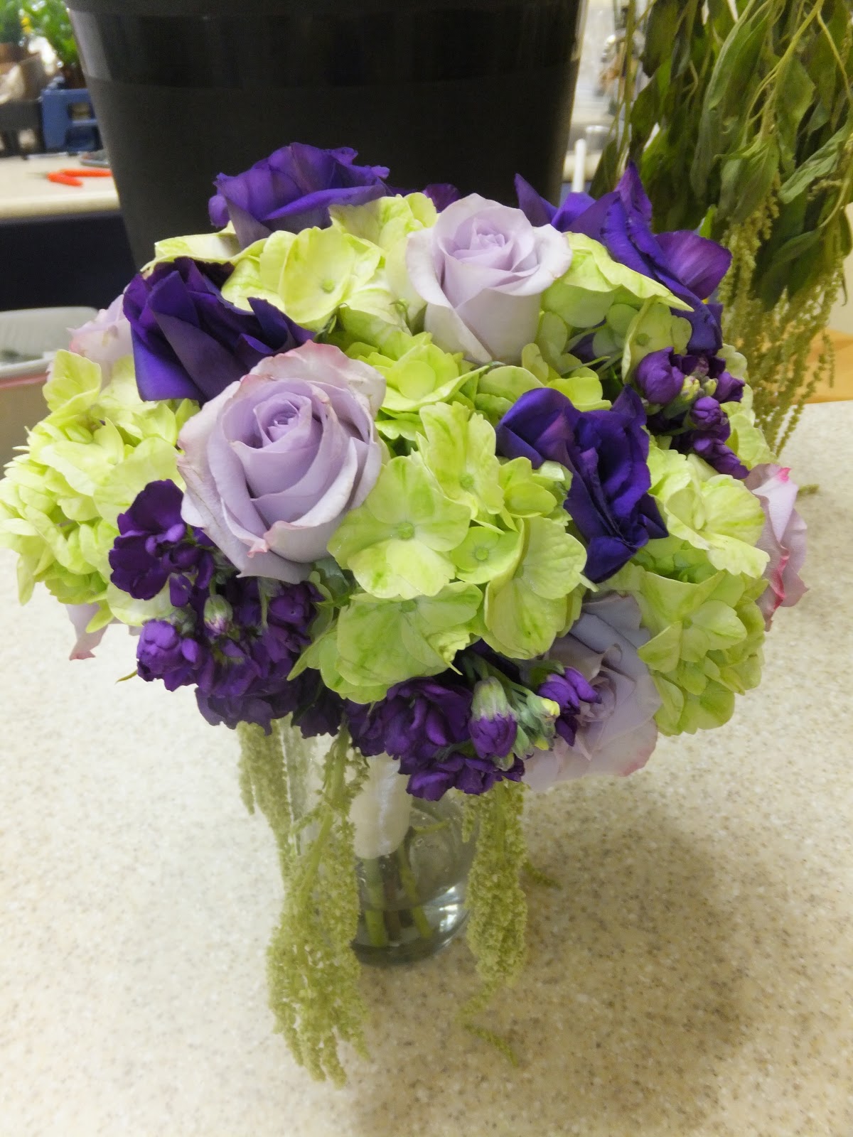The fun contrast in colors of this bouquet caught the attention of the brides guests. (Plum lisianthus, lavender roses, tinted green hydrangea, plum stock, and green maranthus.)