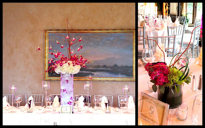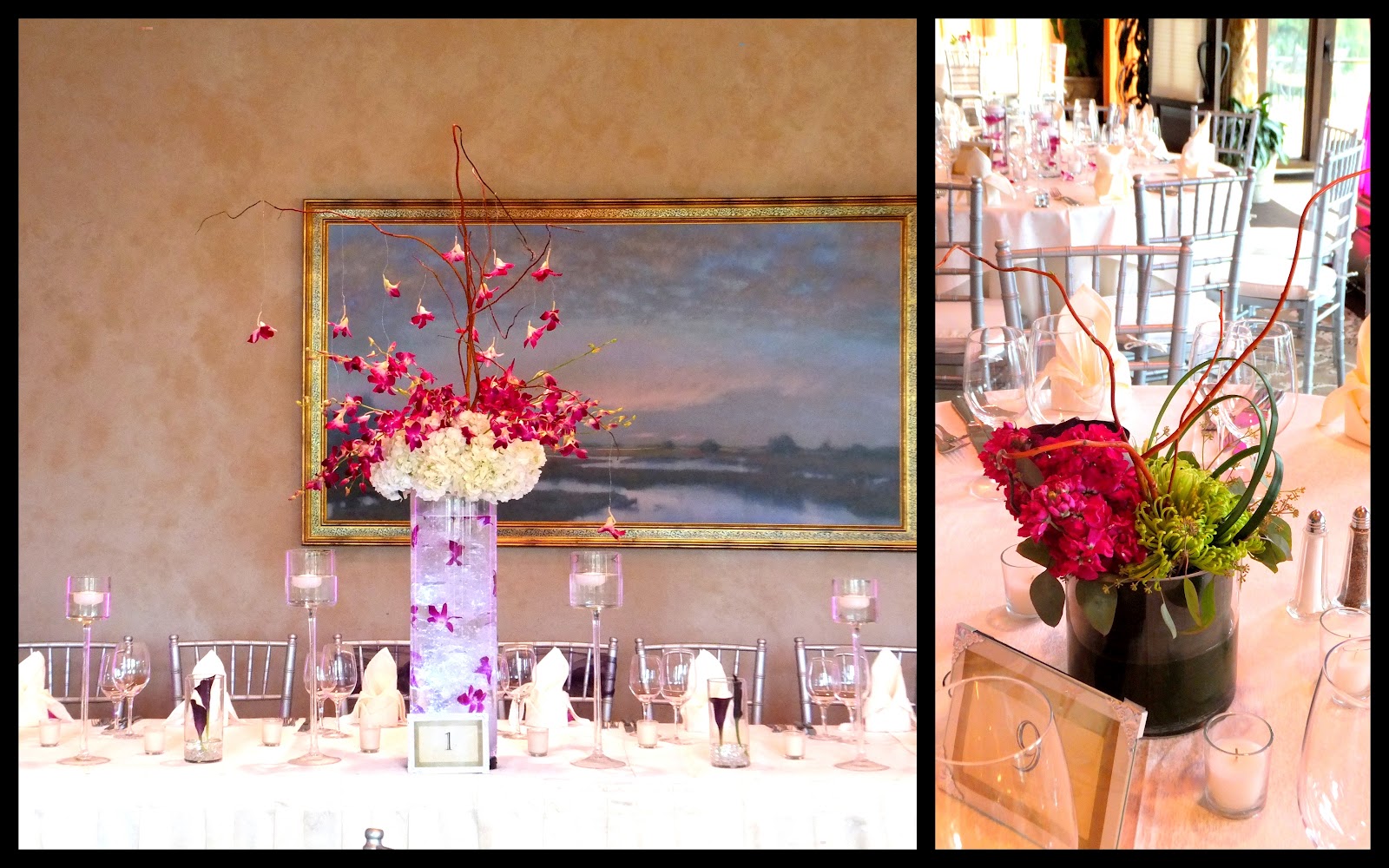 The groom wore a boutonniere of lisianthus and dusty miller with amaranths accents. Her altar pieces were a beautiful mix of purple gladiolas, orchids, spider mums, and stock with large tropical leaves.Her head table was a fun arrangement of white hydrangea with dendrobium orchids blooms suspended in the vase and above the arrangement.