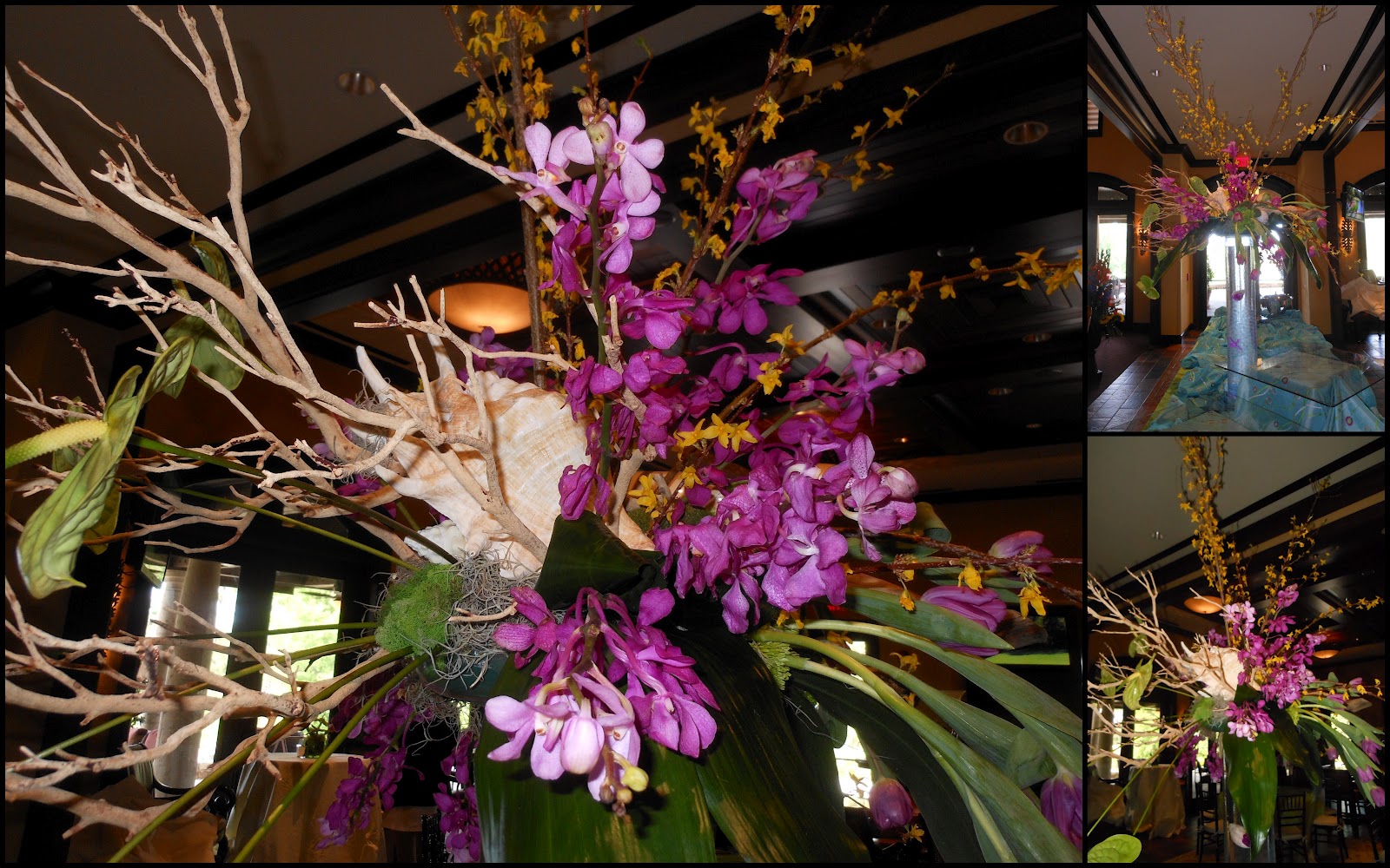 Each year we have a wonderfully busy Easter weekend with lots of events and fun parties. But we always like to showcase our annual events at The Club at Carlton Woods starting with Friday nights seafood buffet. Above is a fabulous piece with purple mocara orchids, green anthirium, purple tulips, curly willow, and green spider buttons in a giant sea shell.