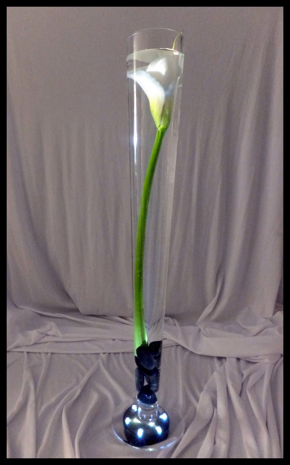 This fun centerpiece with a submerged calla lily is a sleek contemporary design illuminated by a white LED light from underneath.