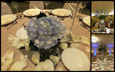 The most beautiful things about flowers, is that they are a product of nature and can be used to create some of the most beautiful things on earth. There are millions of possibilities and anything you can dream we can create! This beautiful reception alternated tall and short centerpieces, using blue agapanthus, alstromeria, bells of Ireland, mixed greens, antique green hydrangea, button poms and roses.