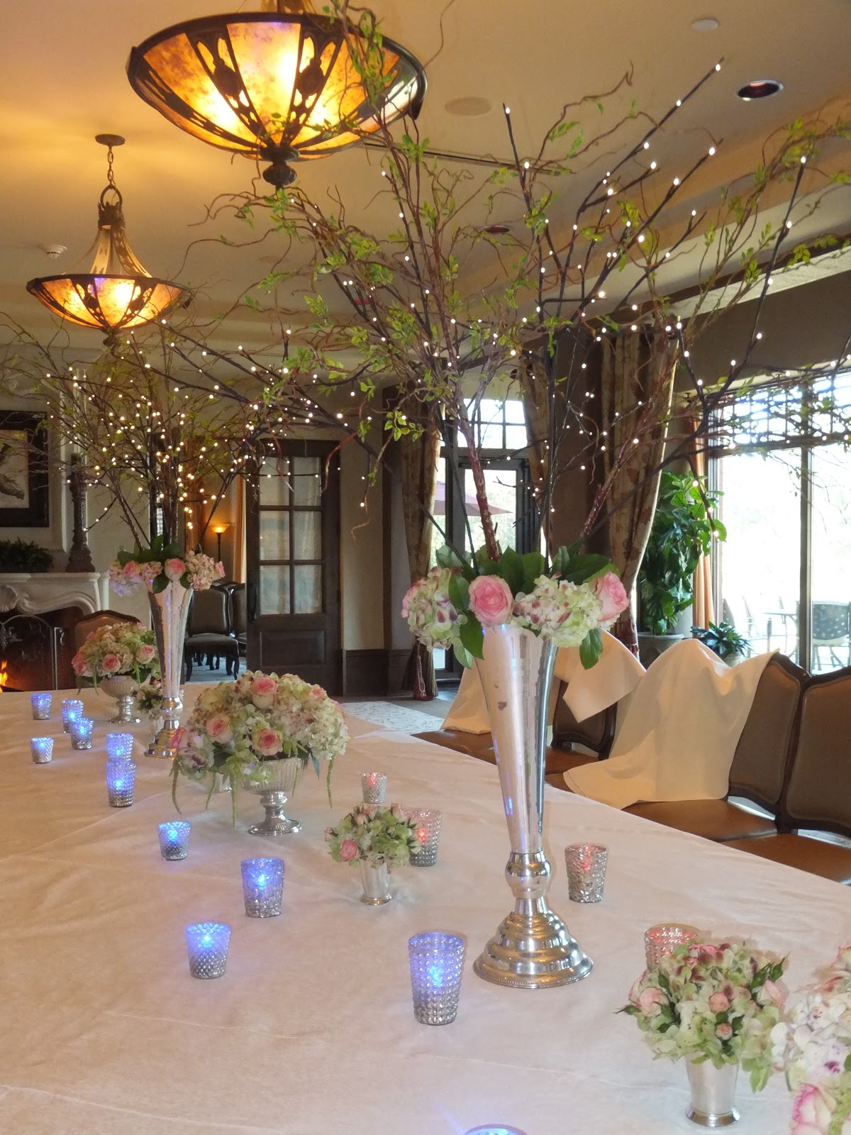 Using silver pedestal vases for the arrangements and silver goblets for the candles heightened the luxurious ambiance of the dinner.