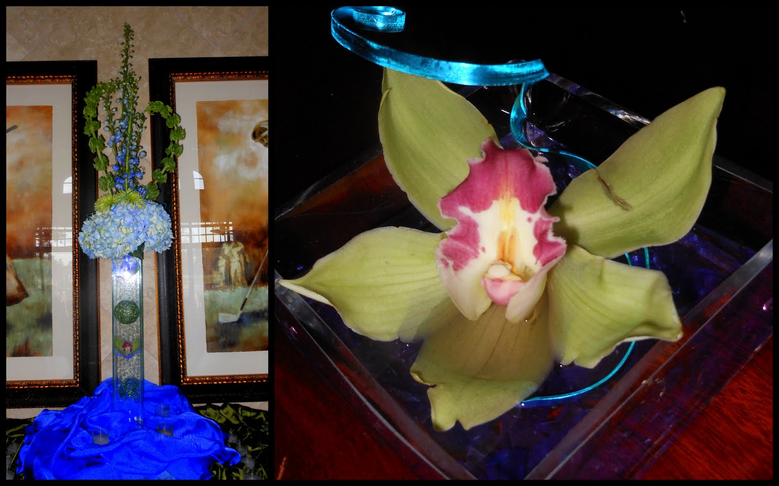The annual sea food buffet at the Fazio club house is one of our favorite events. It's always fun to add a little surprise in the flowers. Last year it was goldfish, this year we opted for the beta fish! They swam around in the larger showpieces. He was gorgeous and fit in perfectly with the vibrant blues and greens.
