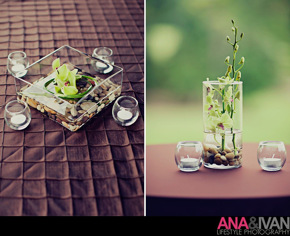 Two beautiful arrangements with a combination of all her colors introduced her guests to the party. Her accent pieces were a combination of various sized vases with teal pebbles, underwater lights, and...