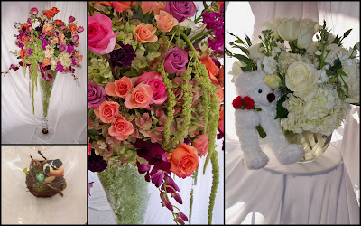 May is one of those months that seems to be simply wild. We love it here; from the weddings to the graduation parties, prom and Mother's Day we stay hoppin'! The picture above are a few styles of arrangements that we used in The Grand Ballroom at The Woodlands Resort and Conference Center. Due to the tall ceiling and shear magnitude of the room we like to use a few different styles of centerpieces...