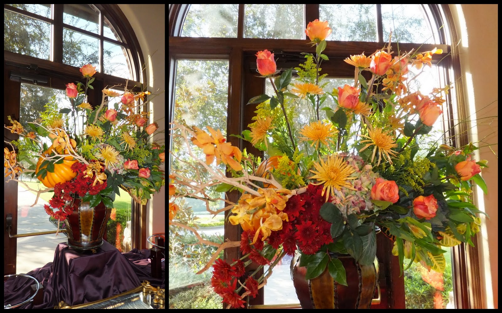 Like any fabulous party you can't have just one centerpiece, especially in a venue as large and fabulous as The Club at Carlton Woods. This beautiful buffet arrangement in a sweeping cornucopia design was filled with roses, wheat, millet, hanging amaranthus, mums, and spiders all in rich autumn tones.