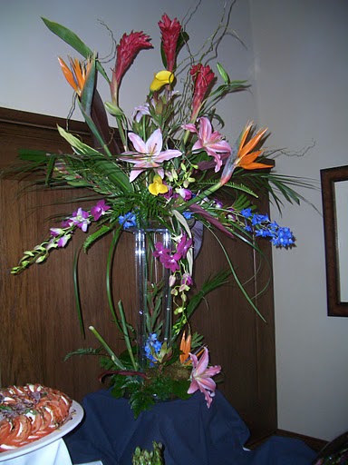 The Club at Carlton Woods is a lovely place for any event, from intimate dinners to lavish receptions, the accommodations are wonderful. The centerpieces above were made with vivid two tone roses, blue hydrangea and orange tulips, and green cymbidium orchids with accents of greenery.