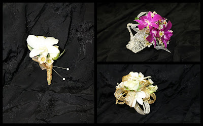 The boutonnieres for the gentlemen were made with myrtle and blue dendrobium orchids tied in black satin ribbon, while the mothers and...