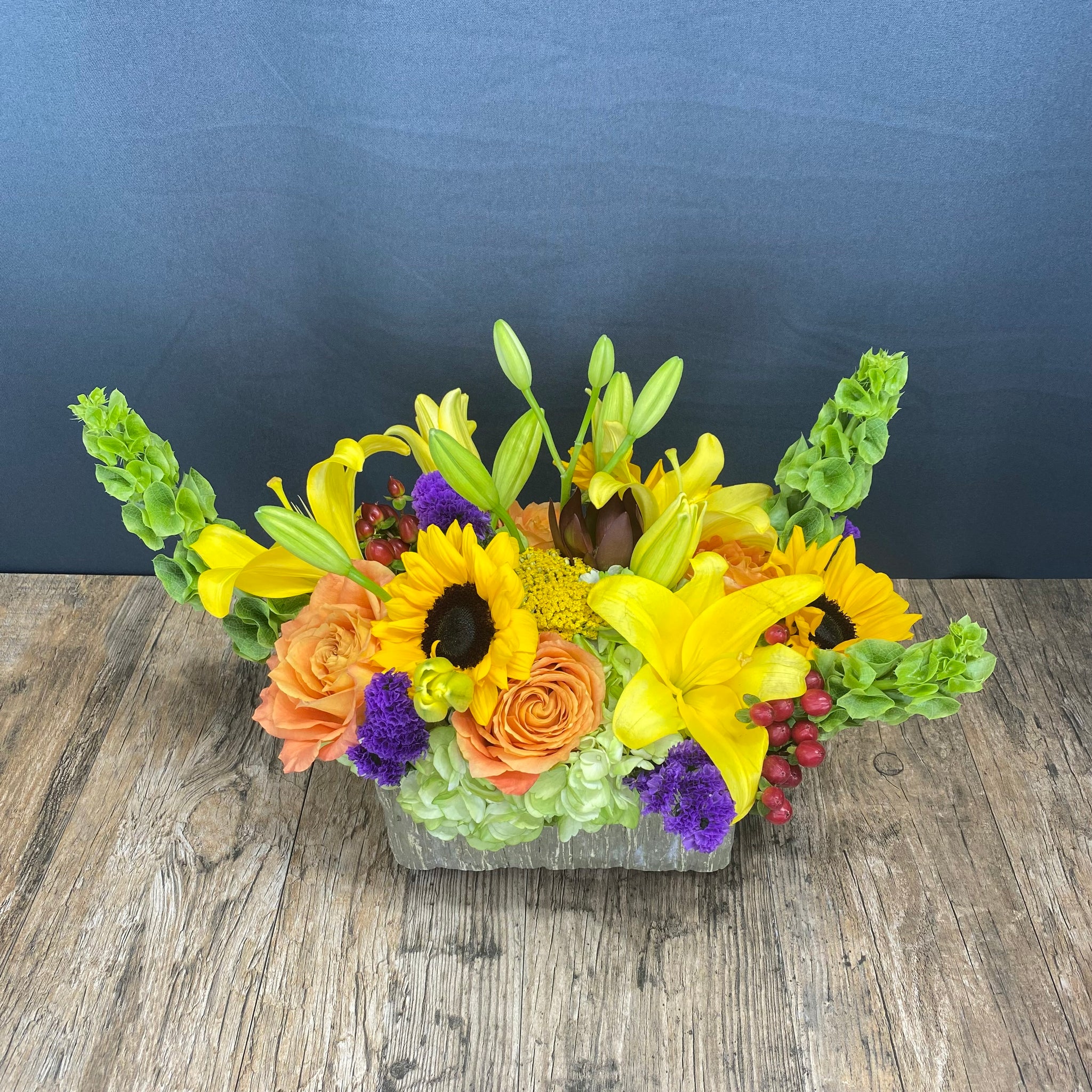 A celebration of the garden at it's most abundant. This long and low design contains Lilies, Sunflowers, Roses, and other blooms of nature.