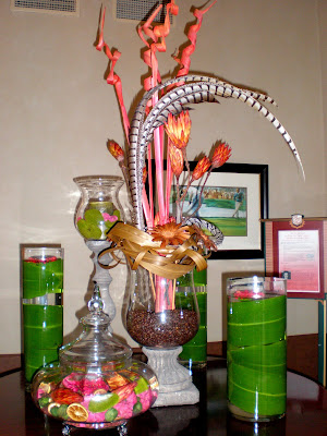 With each change of season we redesign a beautiful dried arrangement for a grand foyer table at the Carlton Woods. This seasons creation is full of movement with vibrant oranges and feather accents. Each week we bring over fresh cylinders with swirled leaves of every kind, and a coordinating floating gerbera daisy. It is the perfect touch of color to coordinate with the beautiful fall tones of... -
