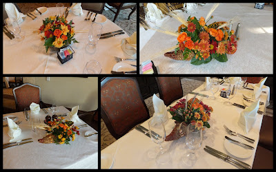 And of course each table had their own miniature cornucopia filled with a variety of rich autumn colors, minature roses, mums, wheat and croton leaves.